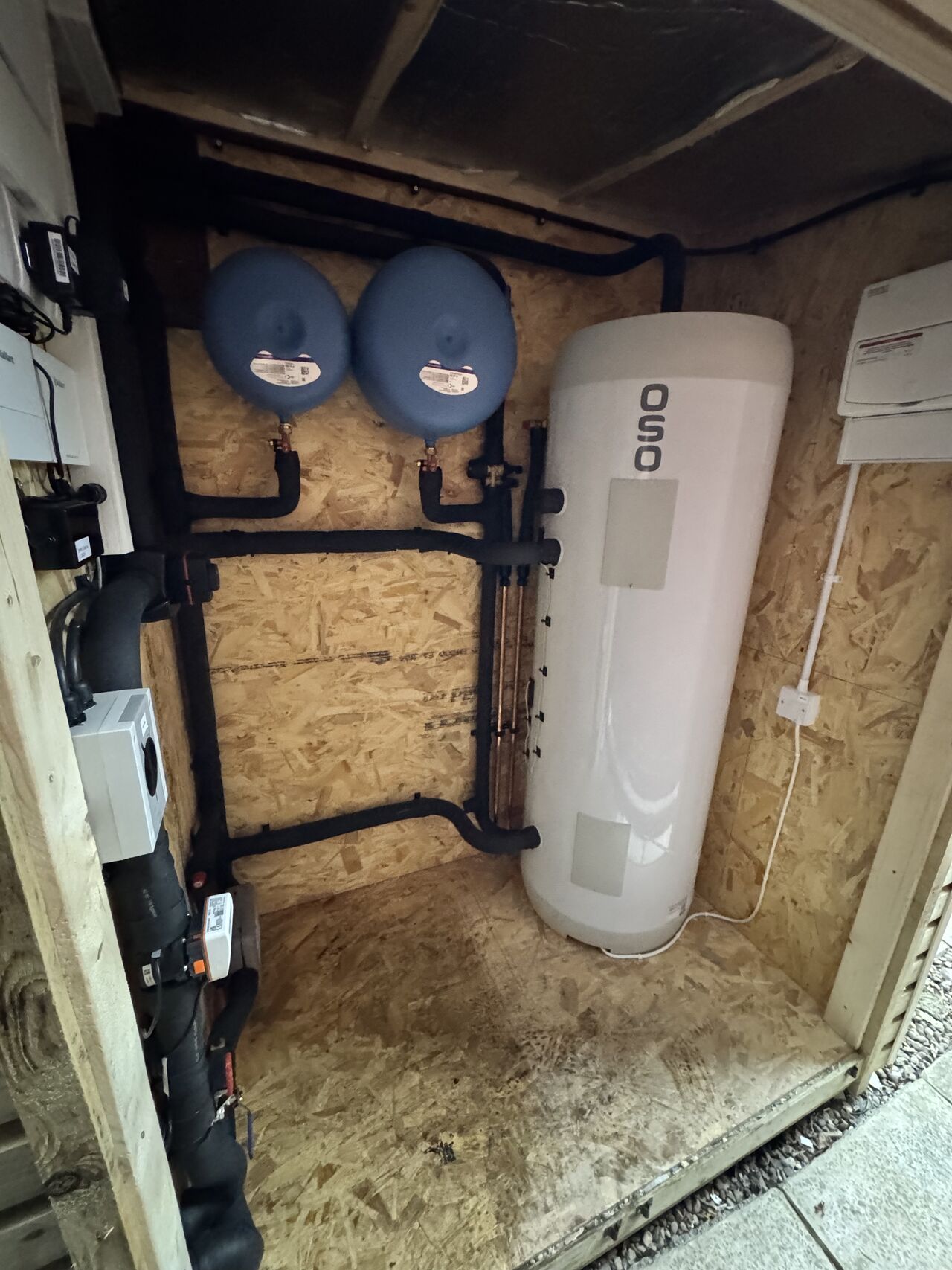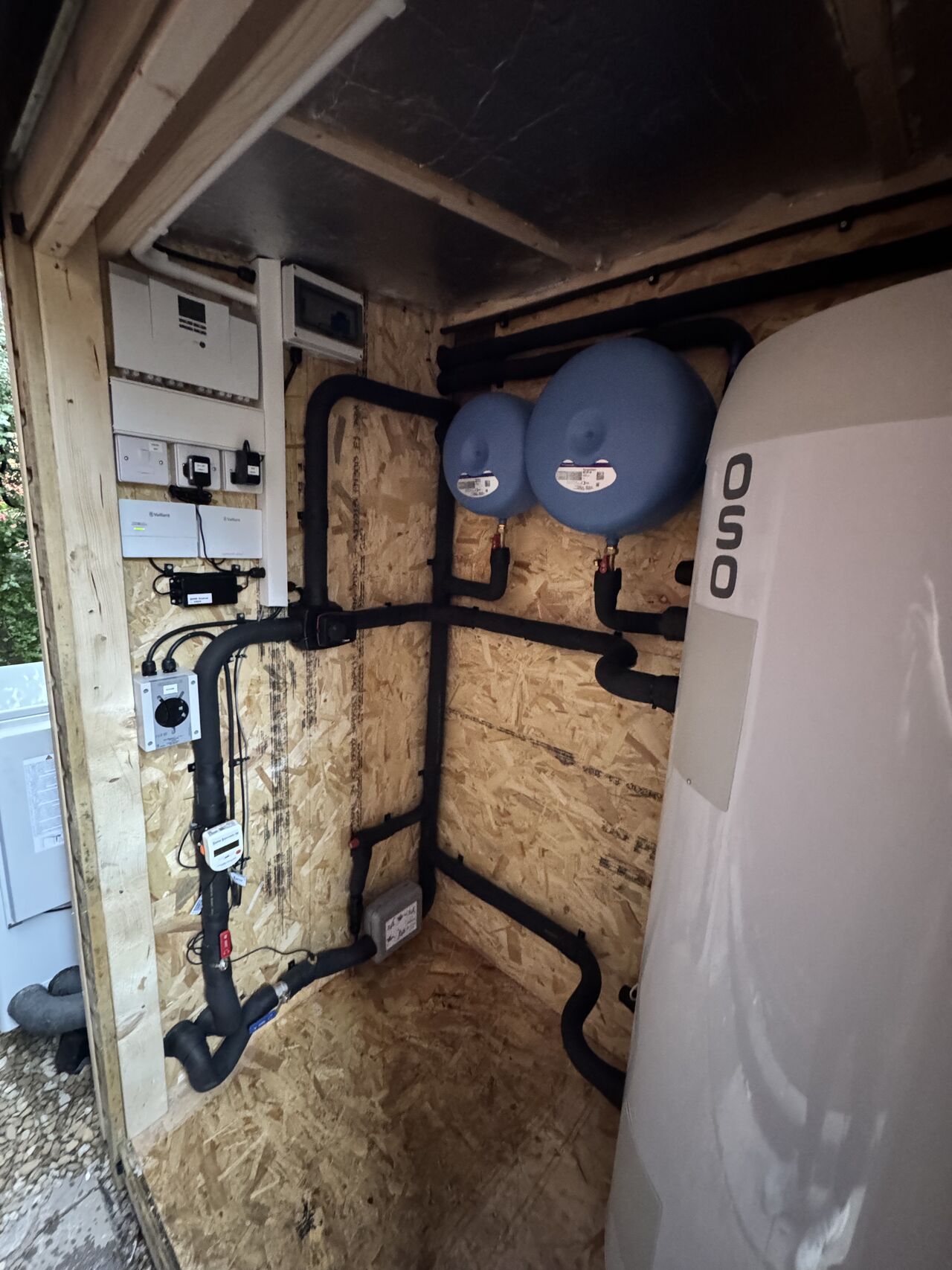 No two homes are the same, it’s why we design every system to the customers needs and the homes requirements. This weeks install has been an interesting one. No space inside for a cylinder so we went external with purpose built shed. This time is a 7kw Vaillant Arotherm and a 300l Geocoil. There was one radiator change internally which was to a k3. We used the existing pipework, and removed a pump from some ufh. It wasn’t all plain sailing, we couldn’t get the cylidner in the shed so I had to deconstruct it slightly and then rebuild it. Again you will see the same products used, Esbe, Imi, Impel, Armacell, Tesla, Eco Clips, Primary Pro. Open energy monitor is fitted on here too, keen to see how this goes. We used the new Proteus Type B HP too. One of my favorite customers too, black coffee and olives were served this evening.